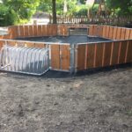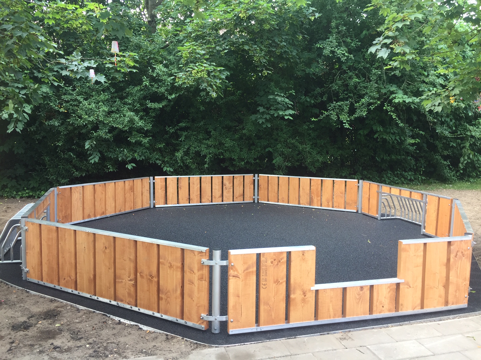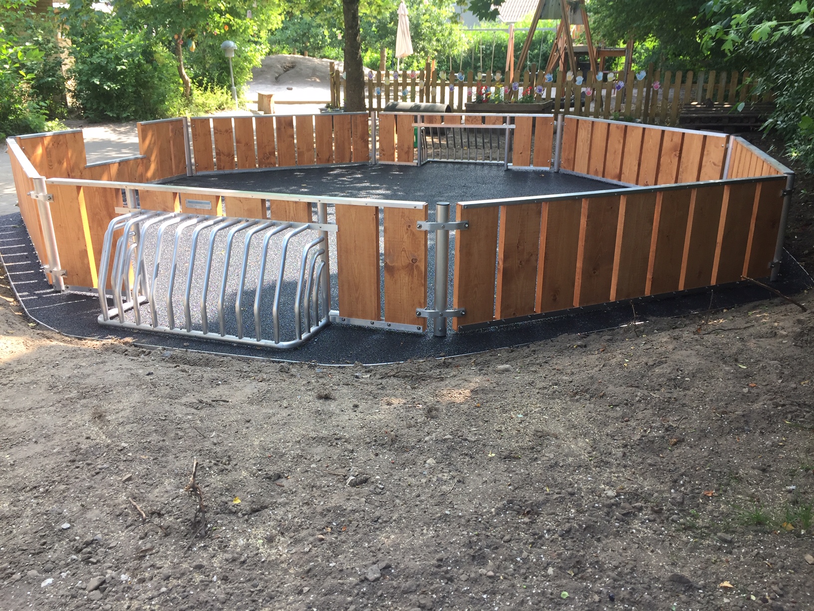 En flot bane med gummiunderlag lavet for børnehave med en ekstra lille detalje med gummi på yderkanten af Pannabanen, så der undgås for meget grus ind på banen.