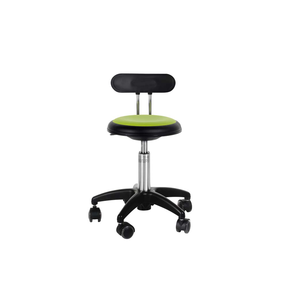 Taburet med oval ryg i unikt design idet understellet er meget lavt, og sammen med en small cylinder kan siddehøjden komme ned på 30 cm. Stolen er specielt velegnet til voksne, der skal ned i børnehøjde, som f.eks. forældre eller pædagoger i daginstitutioner og specielt i garderoben.