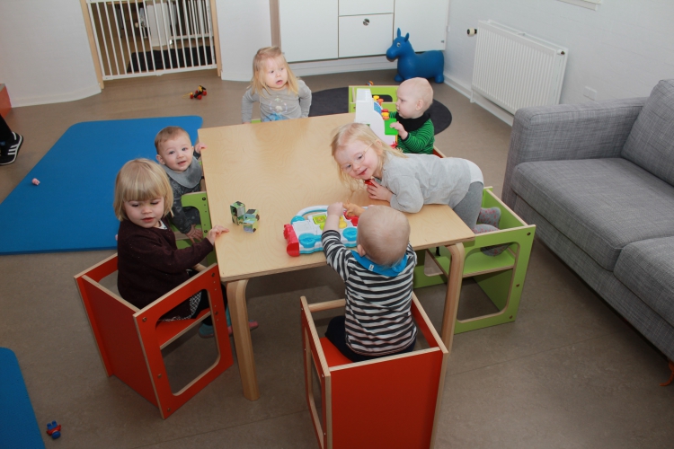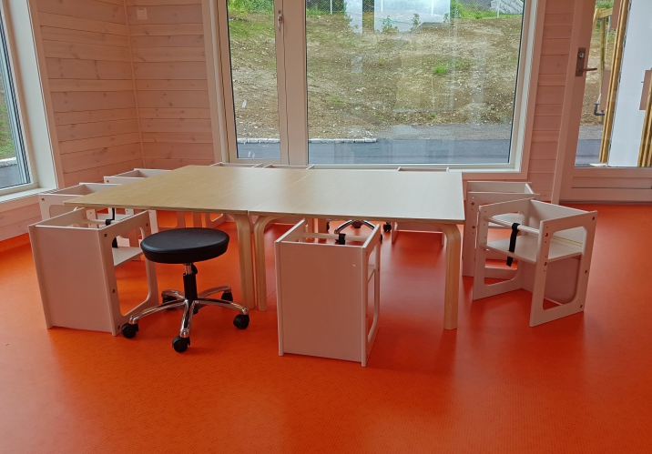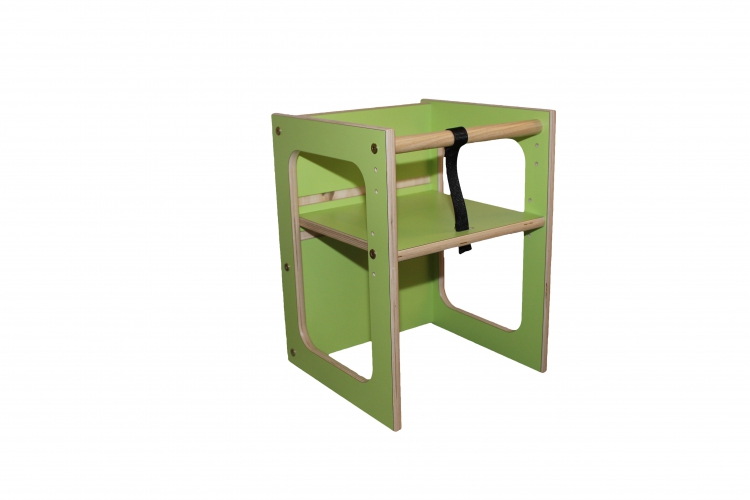 Kassestolen med indstillelig højde, kan både bruges som stol og som et lille legebord. Fjern rundstokken og du har en almindelig stol.