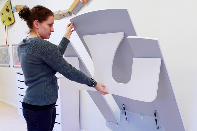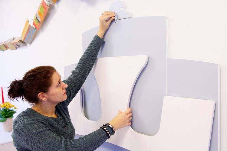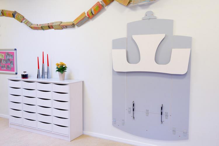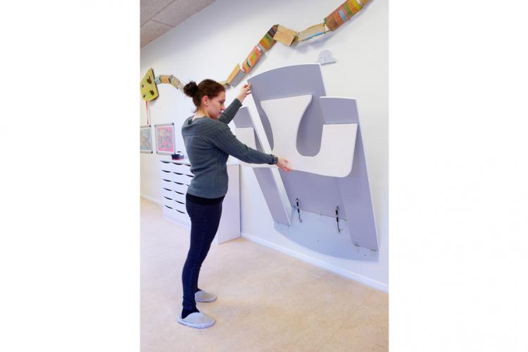 Klapbord med integrerede bænke til ophæng på væg giver pladsbesparelse, så når bordpladen er oppe, kan pladsen udnyttes til leg og udvikling.