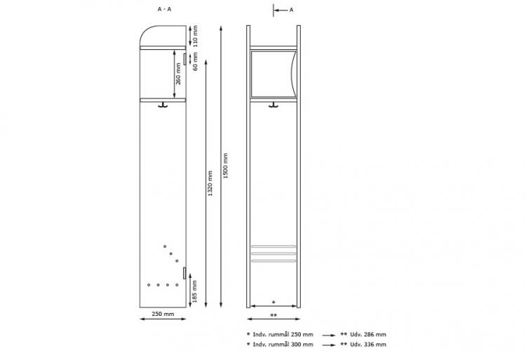 Mål: Højde:1500mm. Bredde:286/336mm. Dybde:250mm.