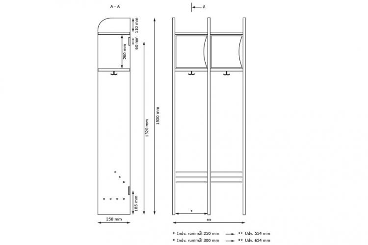 Mål: Højde:1500mm. Bredde:554/654mm. Dybde:250mm.