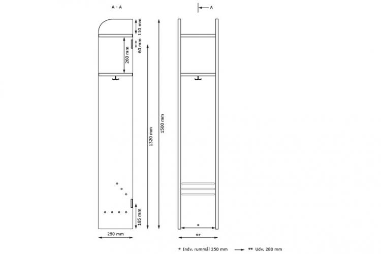 Mål: Højde:1500mm. Bredde:280mm. Dybde:250mm.
