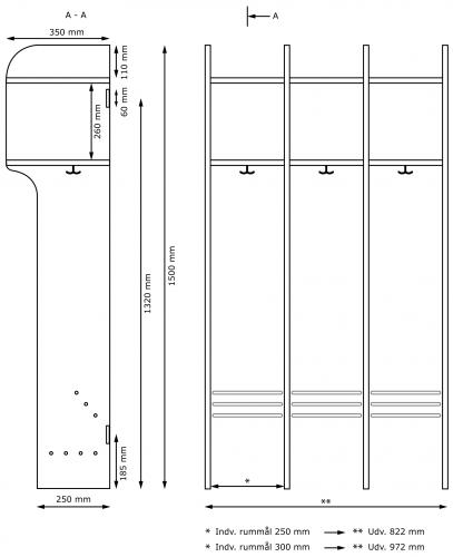 Mål: Højde:1500mm. Bredde:822/972mm. Dybde:350/250mm.