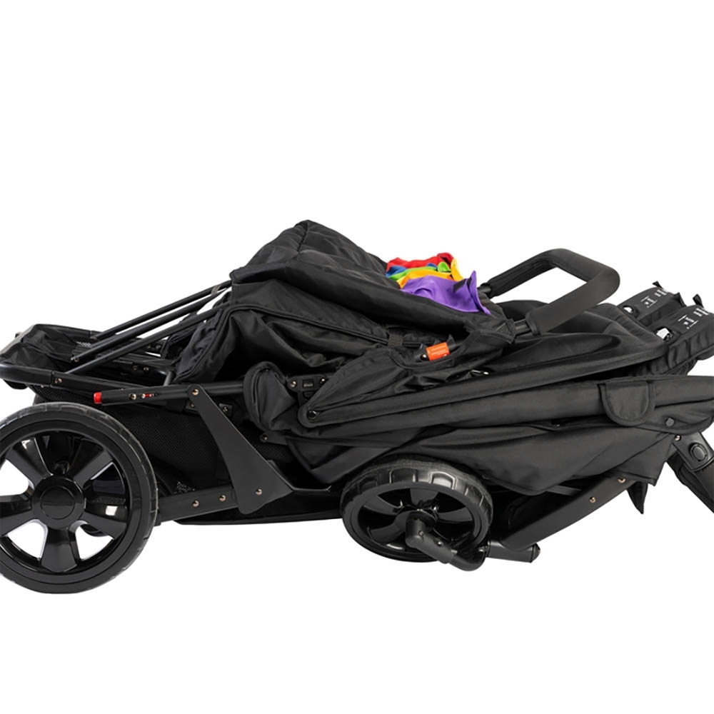 Stellet er lavet af letvægtsstål, og kan klappes sammen ved at bruge 2 hænder samtidig. Vognen har justerbar fodstøtte, låsbar fodbremse og leveres med 2 stk. aftagelige parasoller. Stoffet er falmemodstandsdygtigt og vandafvisende. Vognen har 10” heavy duty EVA forhjul – og 12” EVA baghjul, som gør vognen egnet til at køre på alle slags veje. Sæderne på vognen er ikke egnet til børn under 6 måneder.
