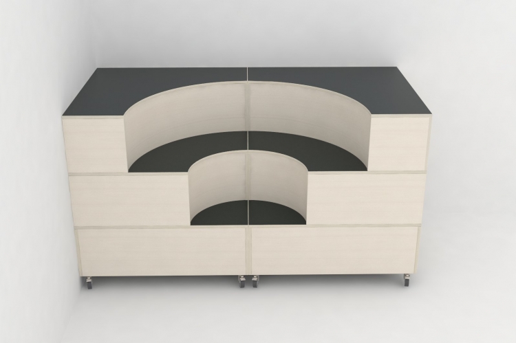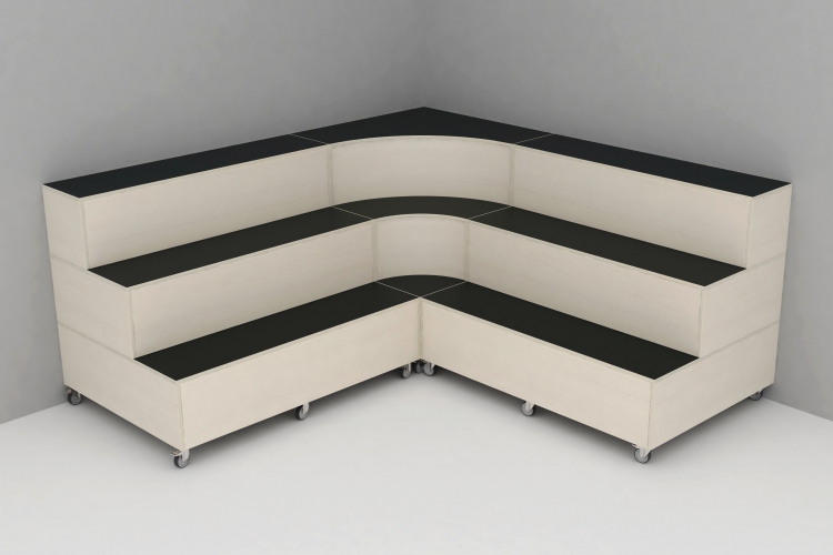 Ved kombination af hjørnemodulet og en eller flere amfiscener er der nemt lavet en god siddeplads i flere niveauer til små arrangementer eller forestillinger. Opsætningen er en fleksibel løsning der både kan stå op ad væg eller frit i rummet.
