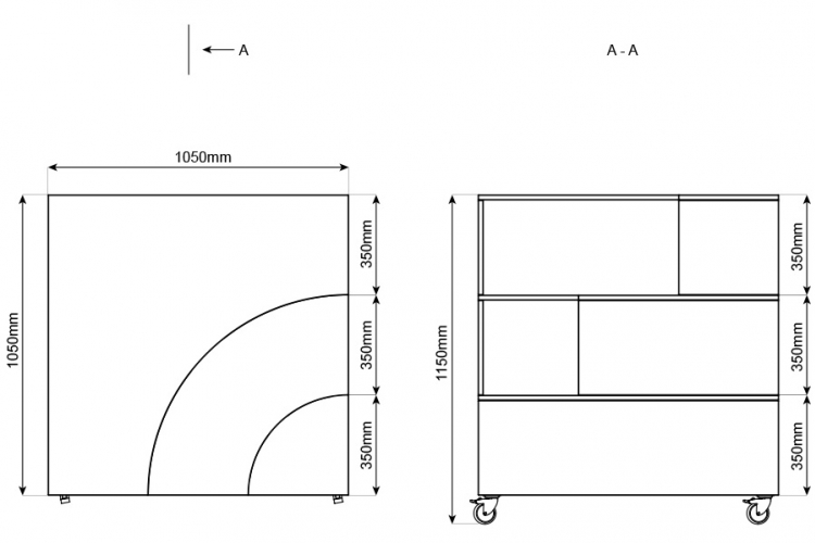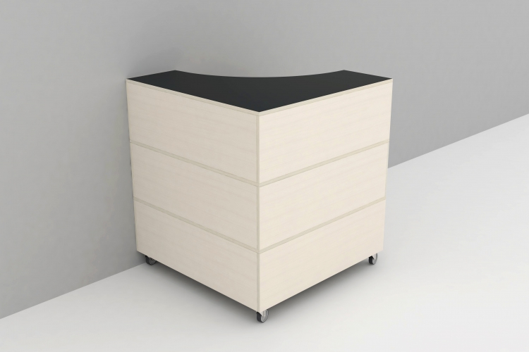 Hjørnemodulet er udført i 18mm hvidpigmenteret birkekrydsfiner med slidstærk sort laminat på topplader. Kan leveres med og uden hjul.