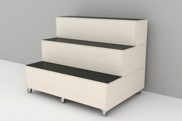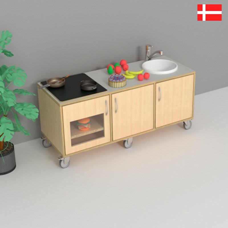 Legekøkken i 15mm birkekrydsfiner i klarlak, lys grå laminat på topplade. Det er monteret med låsbare hjul.