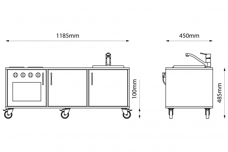 Legekøkken med 4 kogeplader med tilhørende drejeknapper. Plastbalje udgør det for vask og der er selvfølgelig også et armatur så det efterligner et almindeligt køkken mest muligt. Der er 3 låger, hvoraf den ene er med plexiglas for at udgøre det som ovn.
