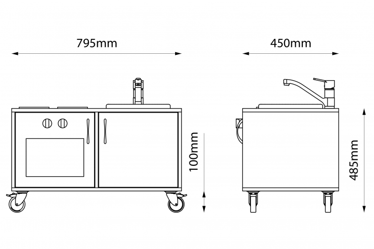 Legekøkken med 2 kogeplader med tilhørende drejeknapper. Plastbalje udgør det for vask og der er selvfølgelig også et armatur så det efterligner et almindeligt køkken mest muligt. Der er 2 låger, hvoraf den ene er med plexiglas for at udgøre det som ovn.