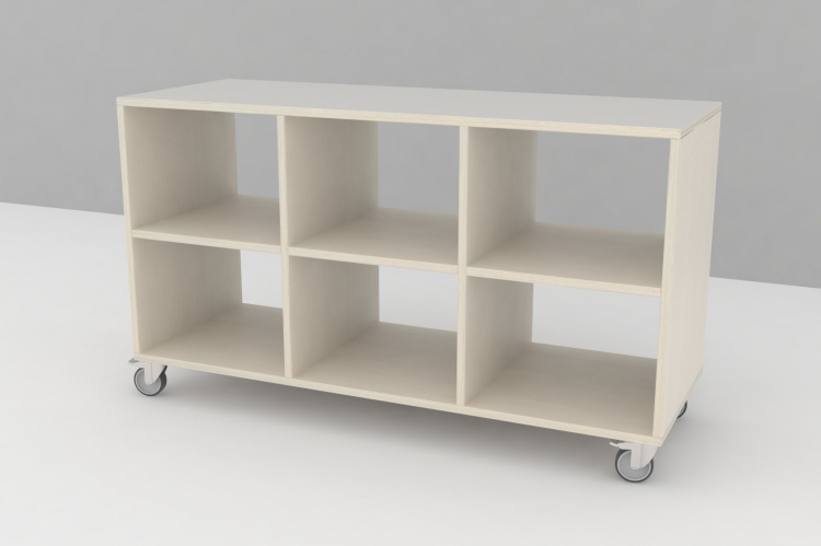 Kubus reol 6 rum i 15mm hvidpigmenteret birkekrydsfiner, uden bund så du selv kan vælge den kassemodel på hjul du ønsker.