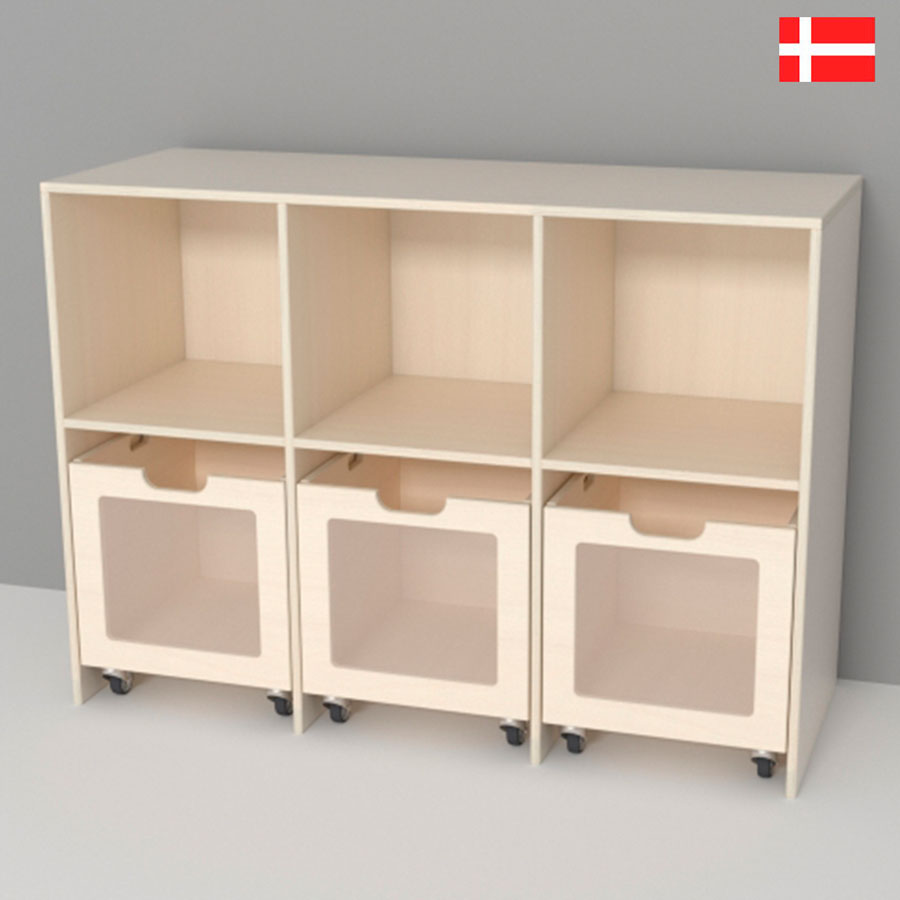 Reolen er uden bund hvor man tilkøber kasserne er på hjul – efter eget ønske med eller uden plexiglas. Eller med laminat på front og valgfri farve. (se link)