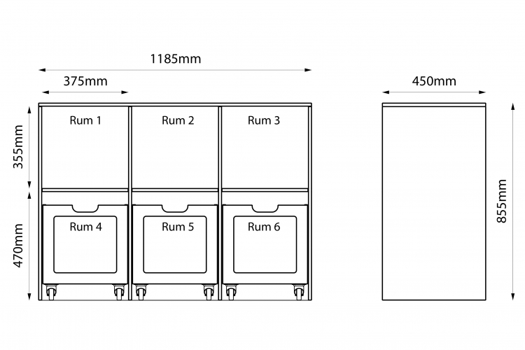 Mål: Højde: 855mm. Bredde: 1185mm. Dybde: 450mm.
