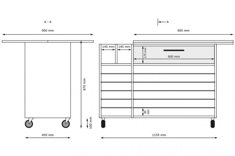 Toppladen kan slåes ud, så man får et godt stort arbejdsbord.
