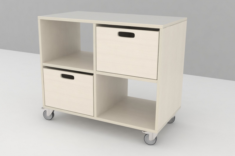 Mobilreol med 4 rum i 18 mm hvidpigmenteret birkekrydsfiner med standardfarve lysegrå laminat på toppladen (eller valgfri farve – se farvekort og noter under bemærkninger).