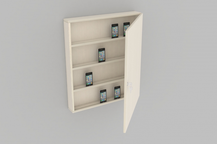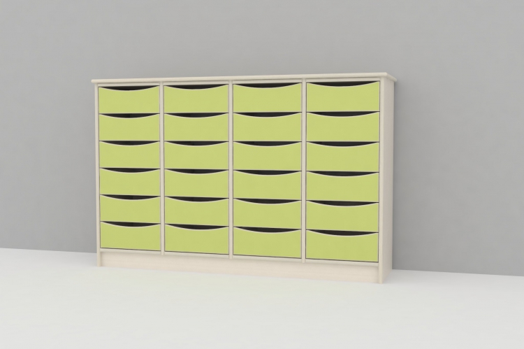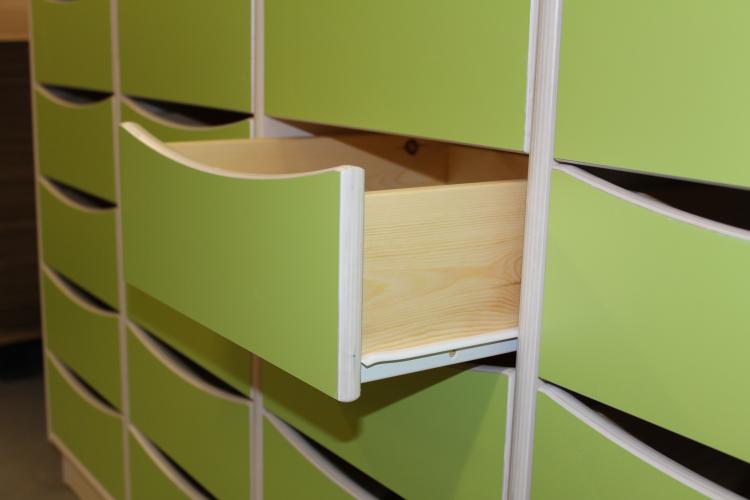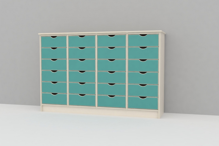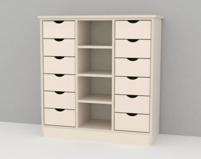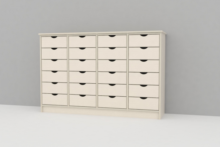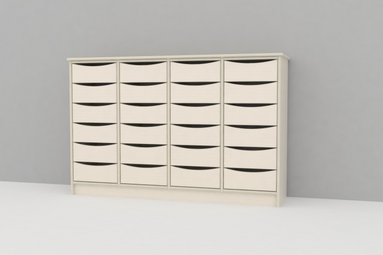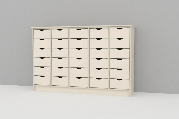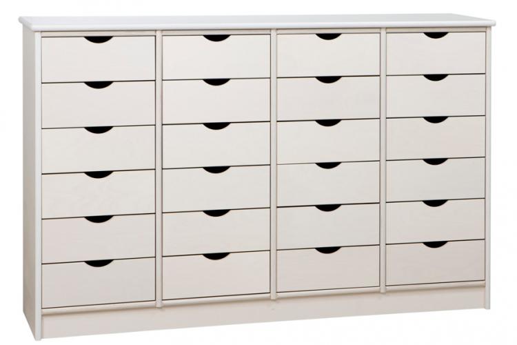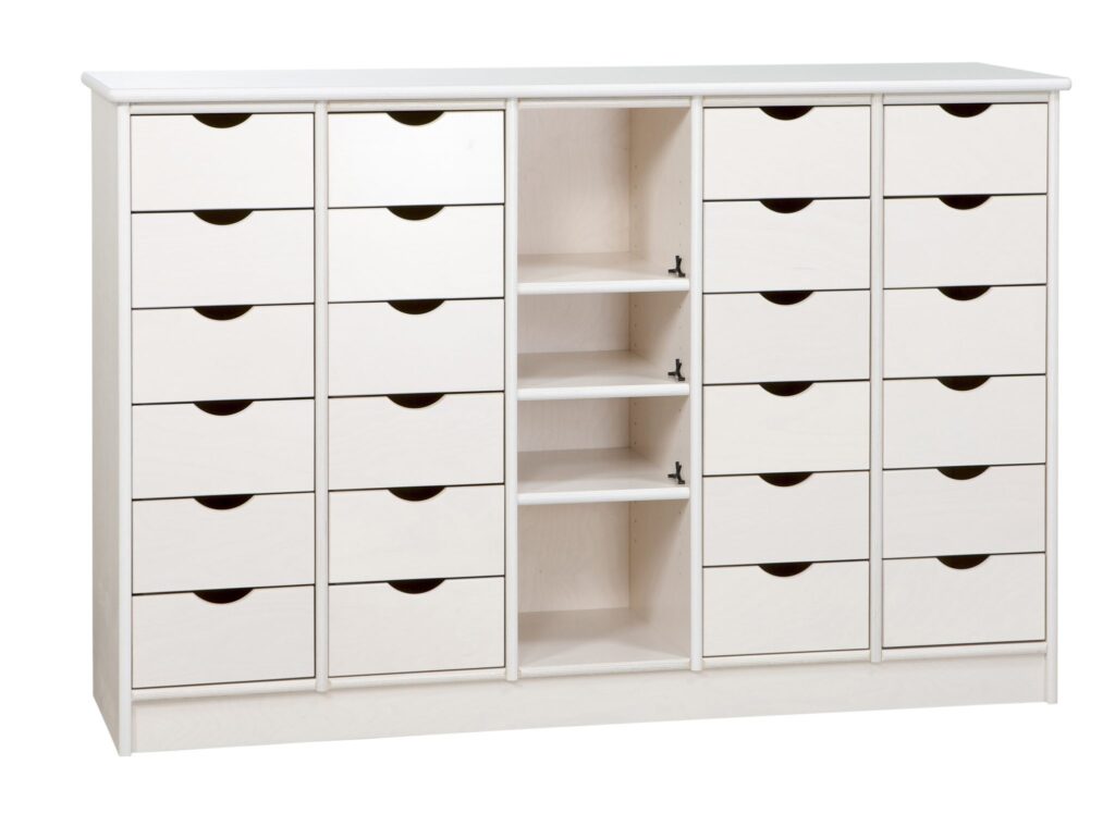 Skuffereol i 18 mm hvidpigmenteret birkekrydsfiner med 24 store skuffer.