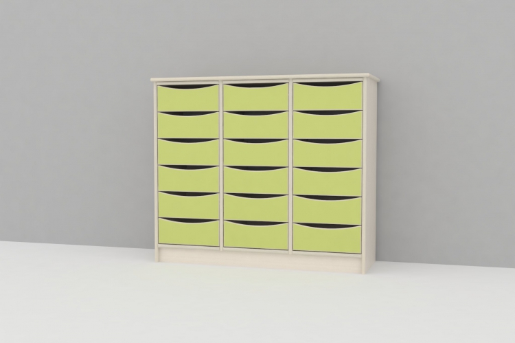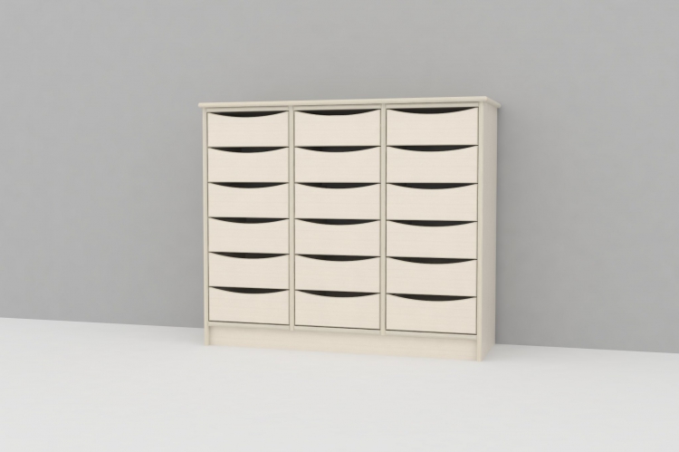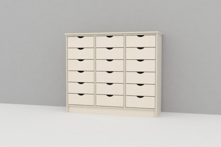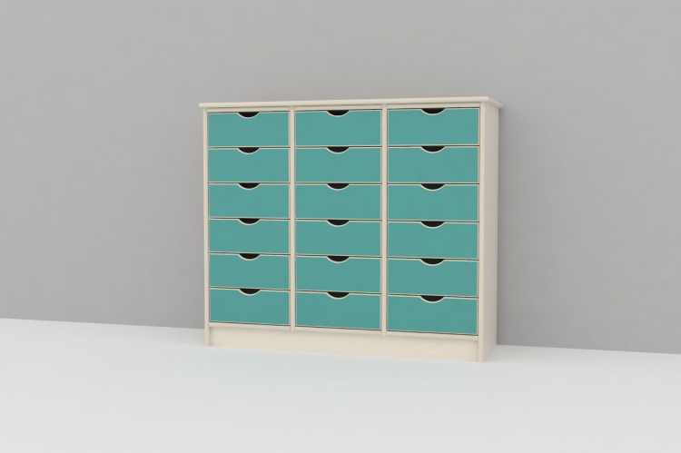 Skuffereol i 18 mm hvidpigmenteret birkekrydsfiner med 18 store skuffer.