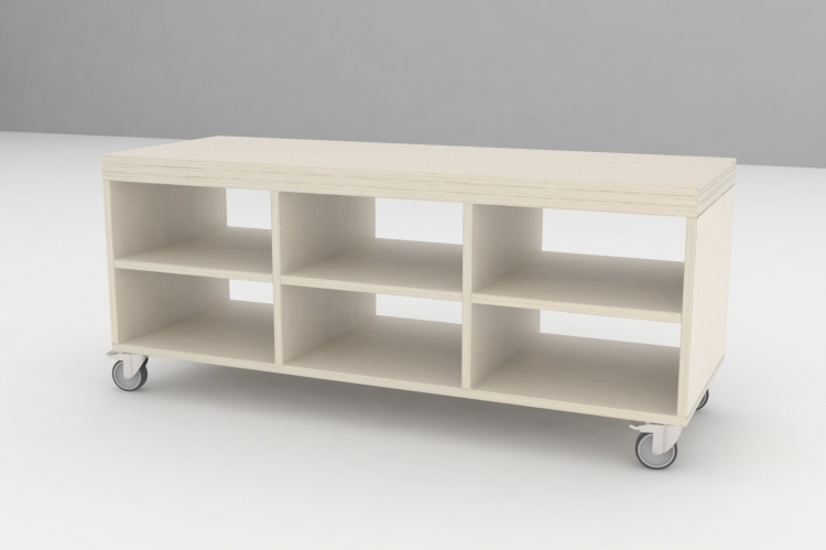 Mobil Funky legereol med 6 rum i 18 mm hvidpigmenteret birkekrydsfiner kan nemt kan slås ud til legebord, sofabord m.v.