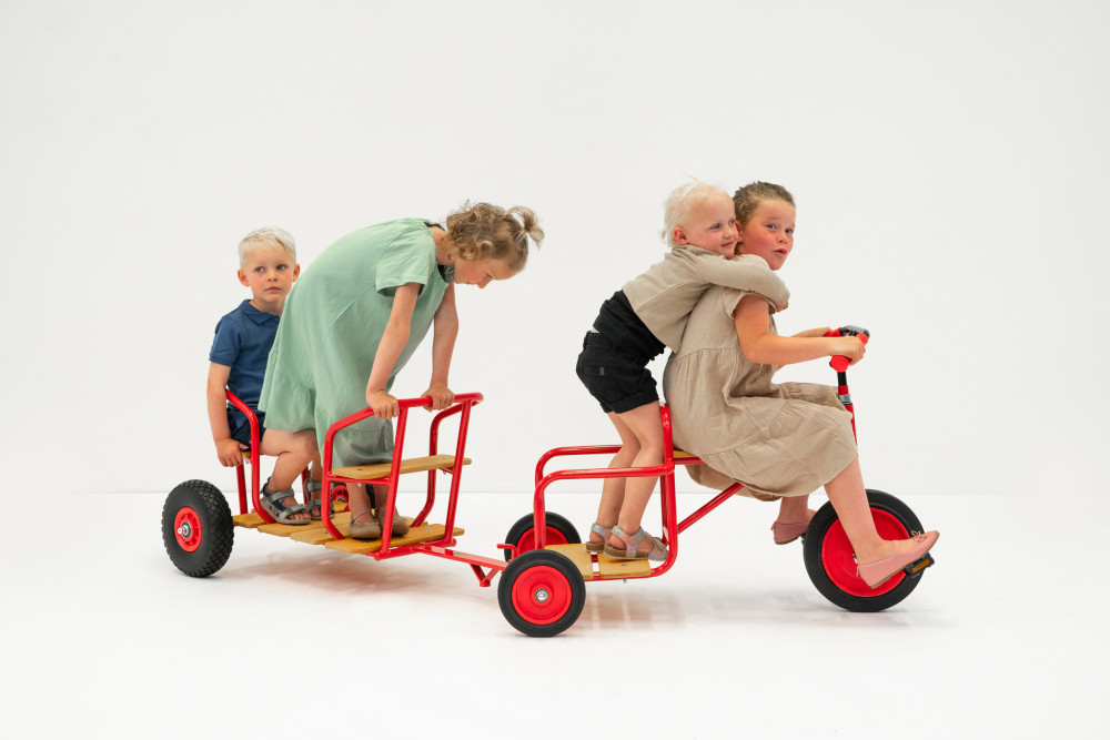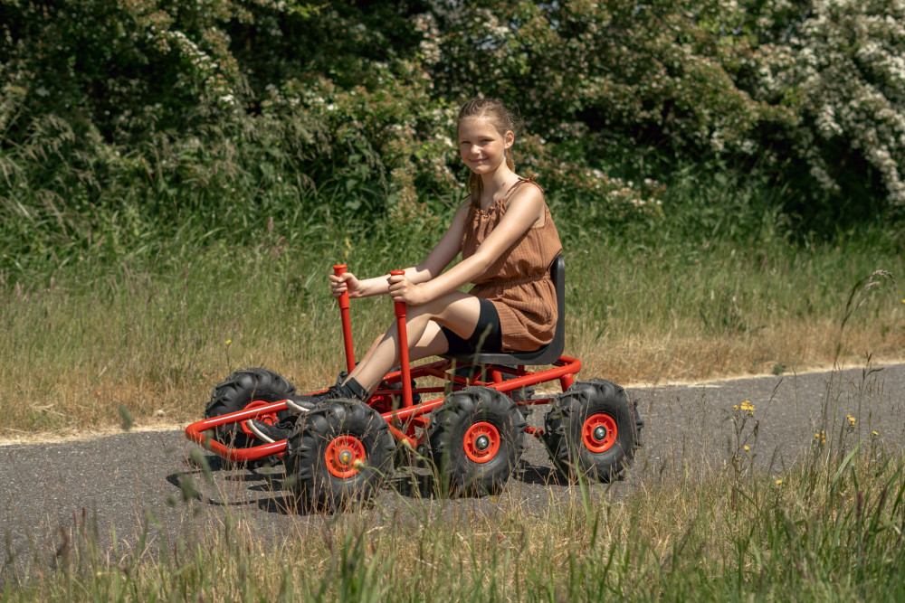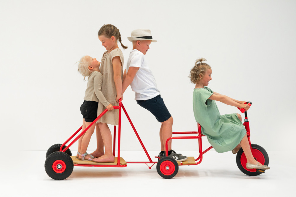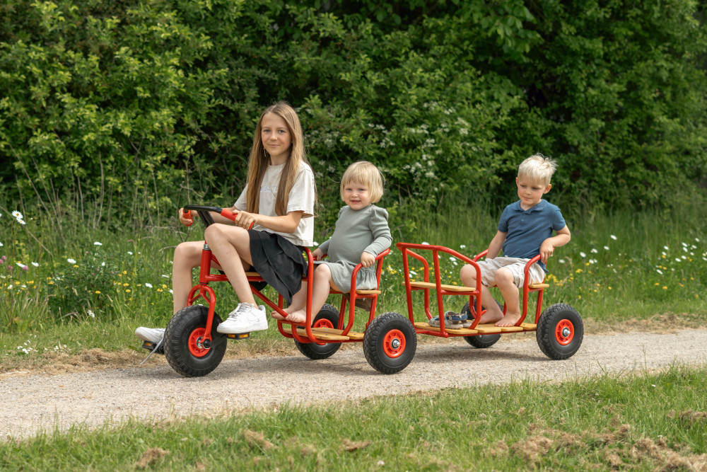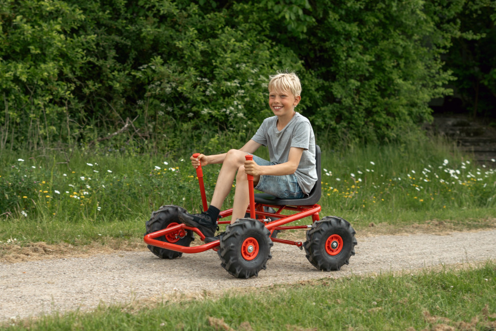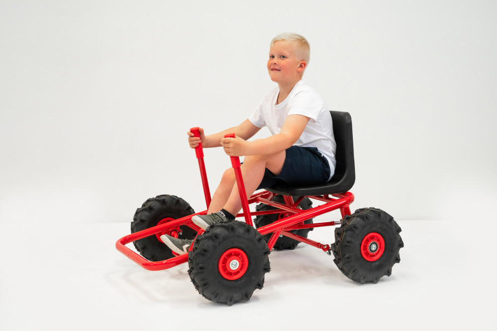 Go-cart er et meget holdbart køretøj designet til daglig brug i institutioner, børnehaver, skoler og legepladser. Dens holdbare konstruktion og høje legeværdi gør den til et populært valg blandt både børn og voksne. Med muligheden for at købe den med ballondæk eller traktorhjul, kan du tilpasse den til dine specifikke behov.