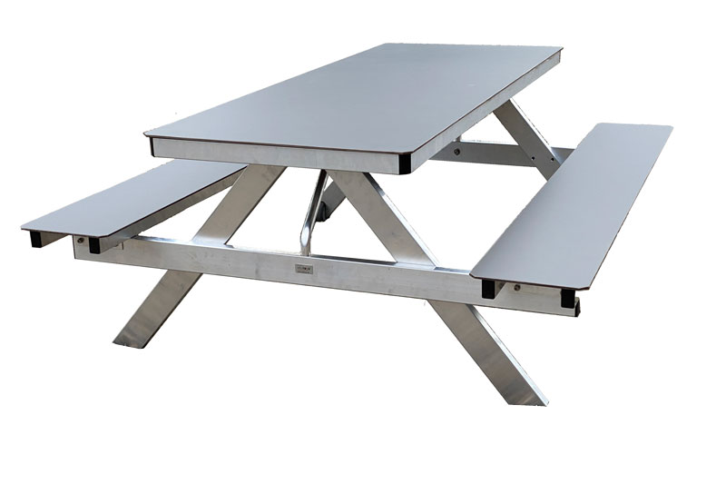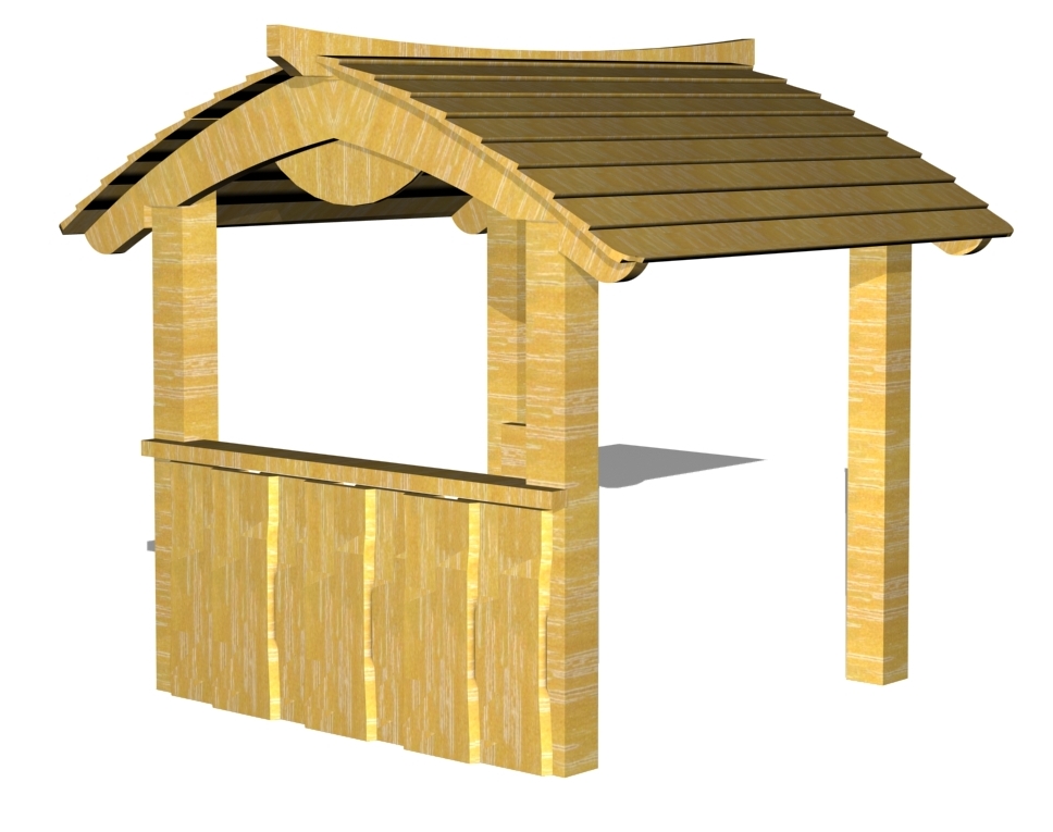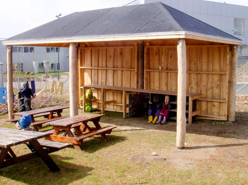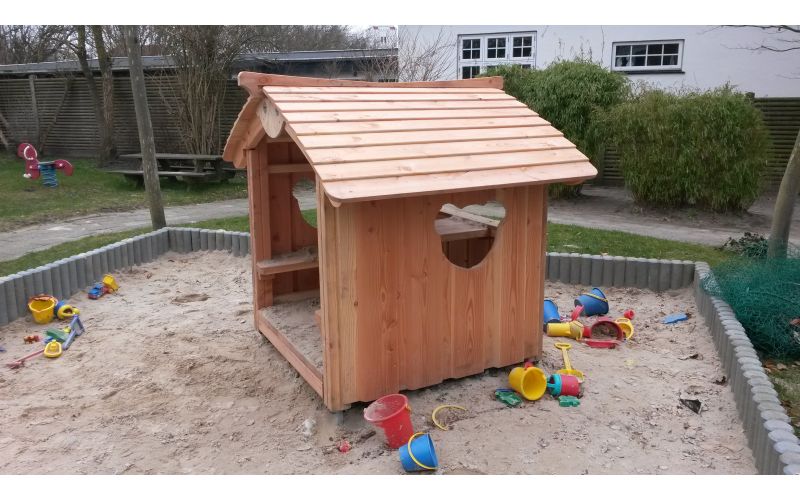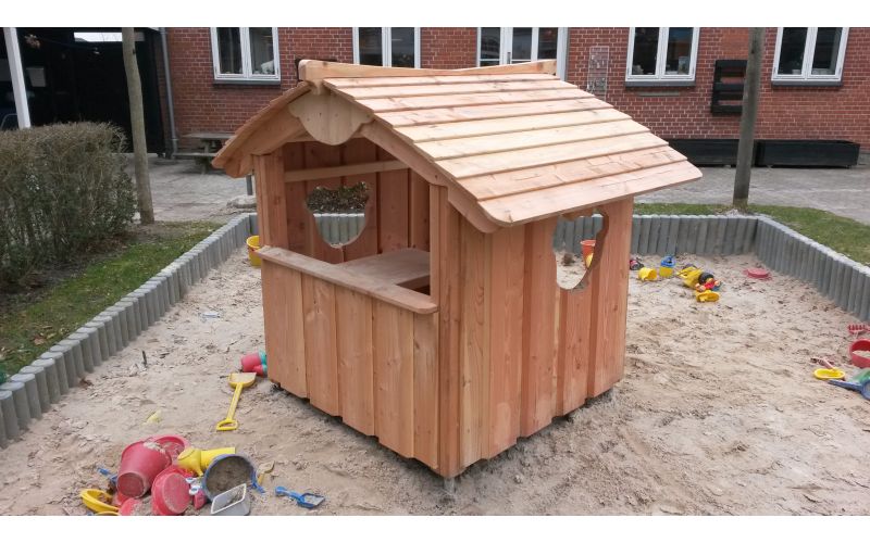 Legehuset har indbygget bænke langs siderne samt et lille bord i midten. Legehuset måler 110x110xH147 cm.